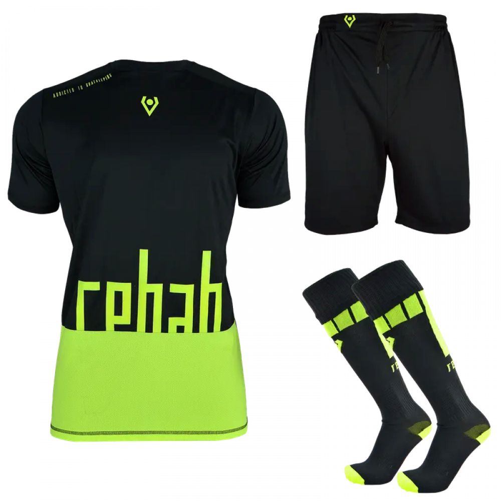 مجموعة حارس المرمى الأسود والأصفر من حراسة مرمى إعادة التأهيل هي حلوى العين. الدولة من الفن ، قصيرة الأكمام جي كيه جيرسي ، والسراويل القصيرة والجوارب. كن مركز الاهتمام!
